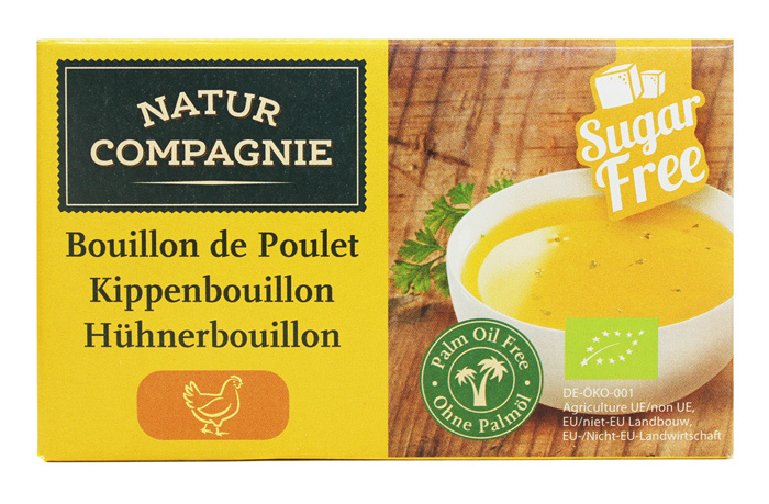 Caldo de pollo con ingredientes procedentes de cultivo biológico sin grasa de palma.