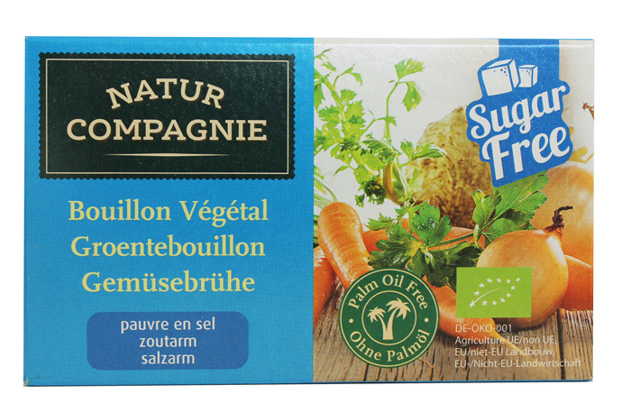 Caldo vegetal con ingredientes procedentes de cultivo biologico bajo en sal, sin gluten, sin lactosa, sin grasa de palma. Apto para veganos.