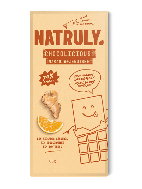 Pasta de Cacao (61%), Fibra de Achicoria (24,87%), Naranja* (6%), Cacao en polvo desgrasado (4,22%), Grasa láctea (1,88%), Lecitina de girasol (1%), Aroma Natural de Naranja y Jengibre (1%).