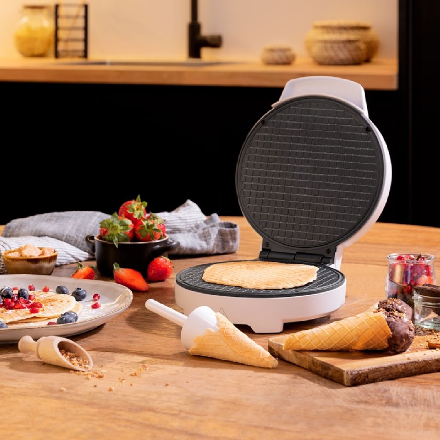 Máquina de waffles elétrica de 1000 W de potência, ideal para preparar cones de gelado e barquilhos crocantes e finos.
