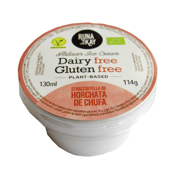 Delicioso helado vegano y ecológico de Stracciatela de Chufa, sin lácteos ni gluten. Para los amantes del sabor de horchata de chufas y del crujiente de chocolate. Ahora puedes disfrutar este placer a la vez que te cuidas. Ecológico, sin gluten y sin lácteos. Tu cuerpo y tu mente lo van a agradecer. Helados elaborados con ingredientes 100% naturales, de primera calidad que siguen un proceso de producción sostenible y respetuoso con la naturaleza. Producto completamente preparado, congelado, listo para consumir.