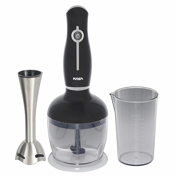 VARINHA 400W C/PICADORA Potência 400W_ corpo soft touch_ pé em inox desmontável_ picadora com capacidade 750ml_ copo medidor 500ml_ lâminas em aço inox_ pega ergonómica.
