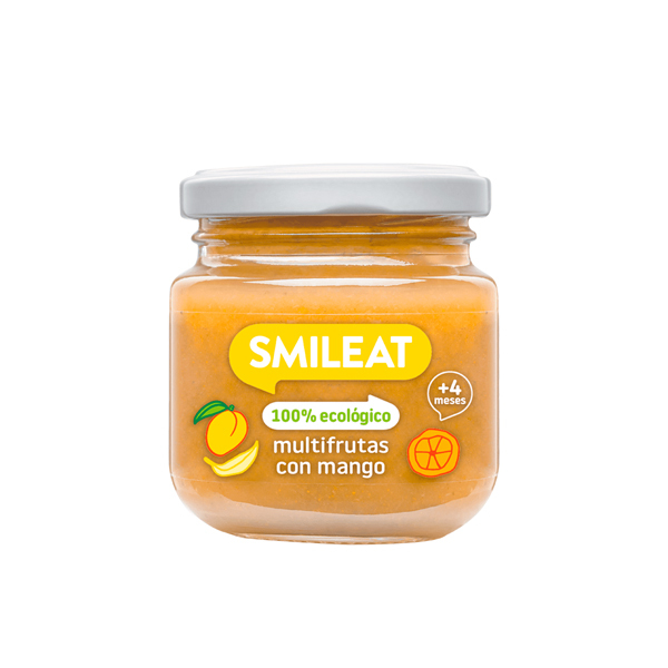 Plátano* (34%), Manzana* (28%), Pera* (27%), puré de naranja* (5.2%) y mango*(4.8%), zumo de limón*. *Procedente de agricultura ecológica.