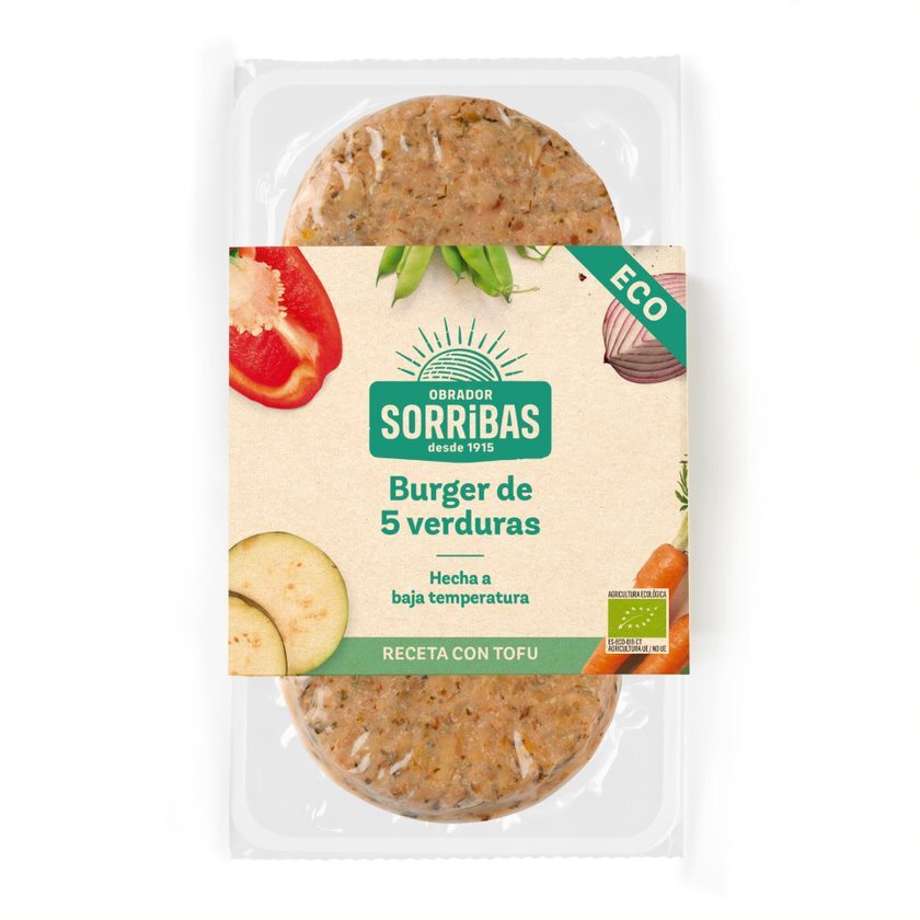 Ni dos, ni tres, ni cuatro. Hamburguesa de 5 verduritas para deleitar a tus 5 sentidos. Con zanahoria, cebolla, calabacín, pimiento rojo, raíz de apio y cantidades ingentes de sabor.
