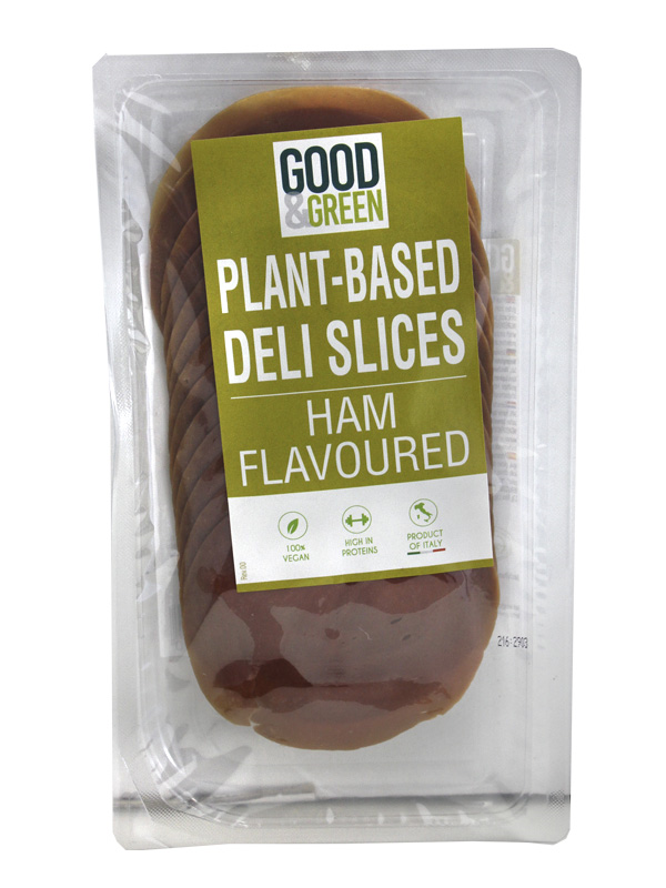 Preparado vegetal sabor speck a base de gluten de trigo y trigo duro harina de trigo. Deliciosas lonchas estilo carpaccio. Ideal para poner al centro como entrante o para bocadillos.