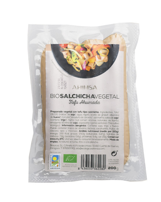 Tofu*(habas de soja*, agua, nigari)(36,7%), aceite de girasol*, albúmina de huevo*,levadura de cerveza*, sal marina, salsa de soja* (contiene trigo entero*), humo(sal, aroma natural de humo), emulgente (lecitina de soja), espesante (goma xantana), . (*de cultivo ecológico).