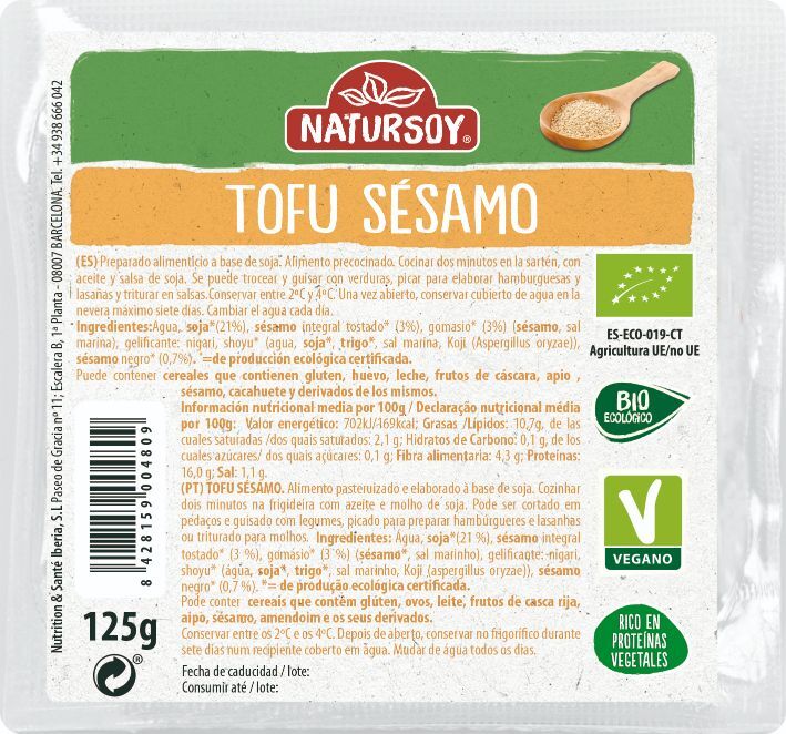 Producto rico en proteínas vegetales. Tofu con sésamo de Natursoy.