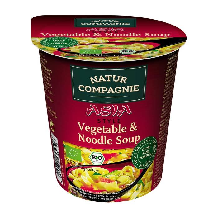 Pasta * (63,5%) (semola de trigo duro *), jarabe de glucosa de maíz, sal marina, almidón de maíz *, azúcar de caña *, extracto de levadura, tomate en polvo * (2,7%), manteca de karité *, zanahoria * (1,8%), puerro * (1,5%), cebollas * (1,3%), jengibre *, calabacines * (0,4%), pimientos * (0,4%), cúrcuma *, hierba del aligustre *, comino *, ajo *, perejil *, * macis, espinaca en polvo * (0,04%), pimienta *.