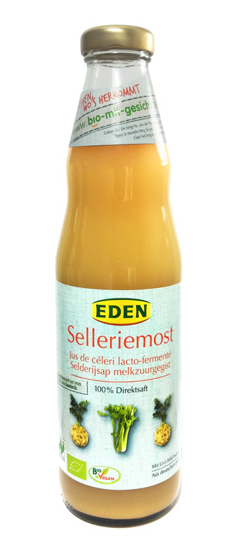 Zumo de apio* fermentado con bacterias lacticas (L( y )-ácido láctico), sal marina, antioxidante ácido ascorbico. Pasteurizado